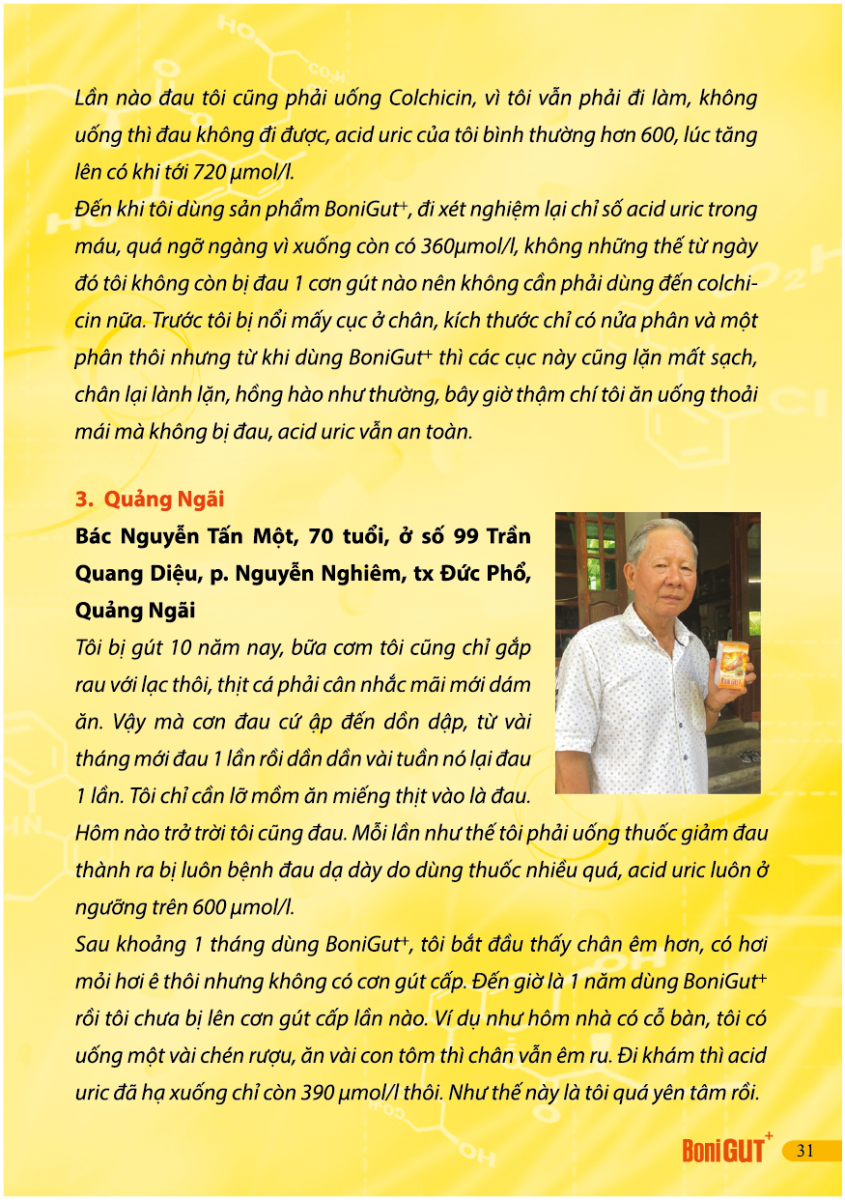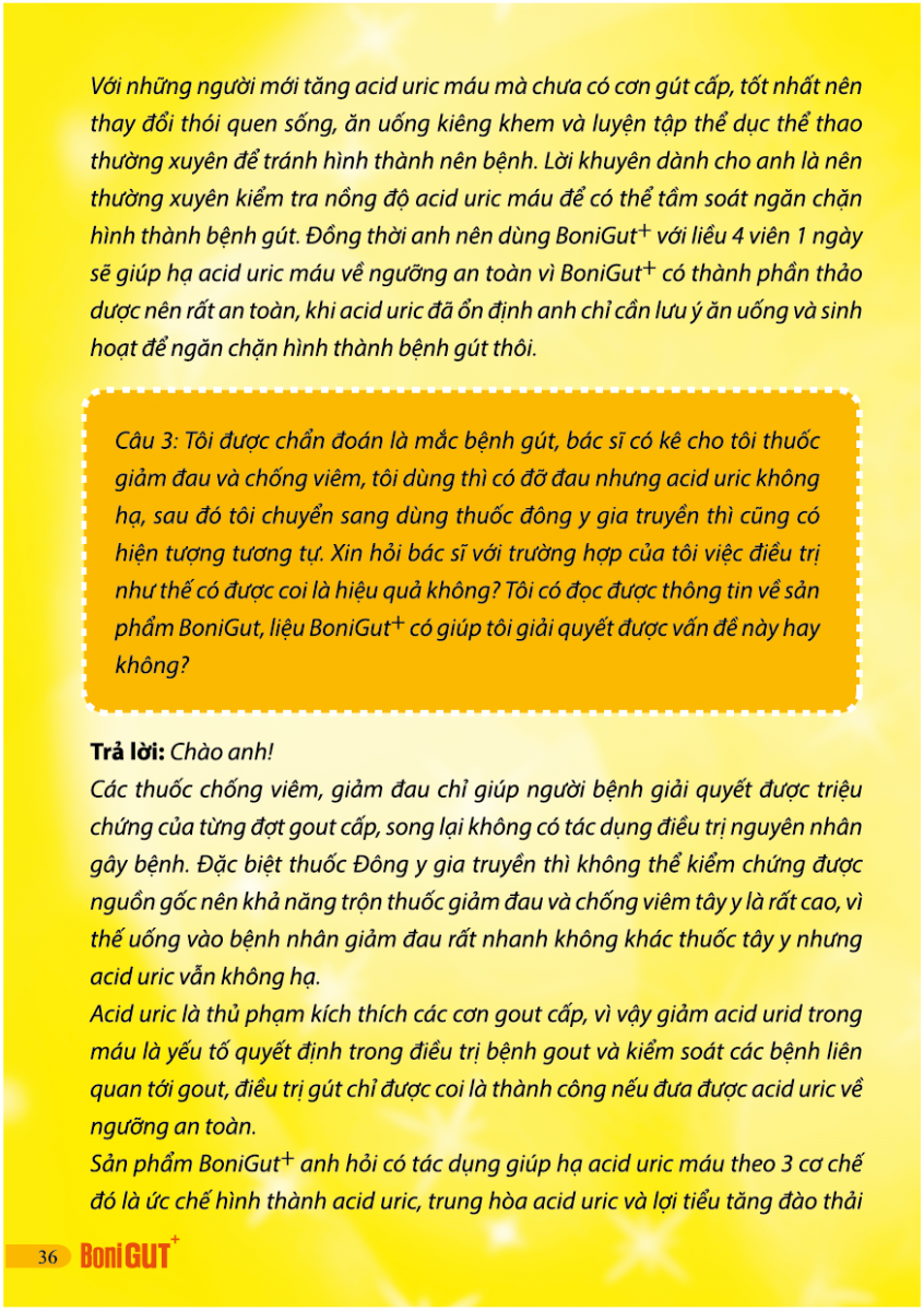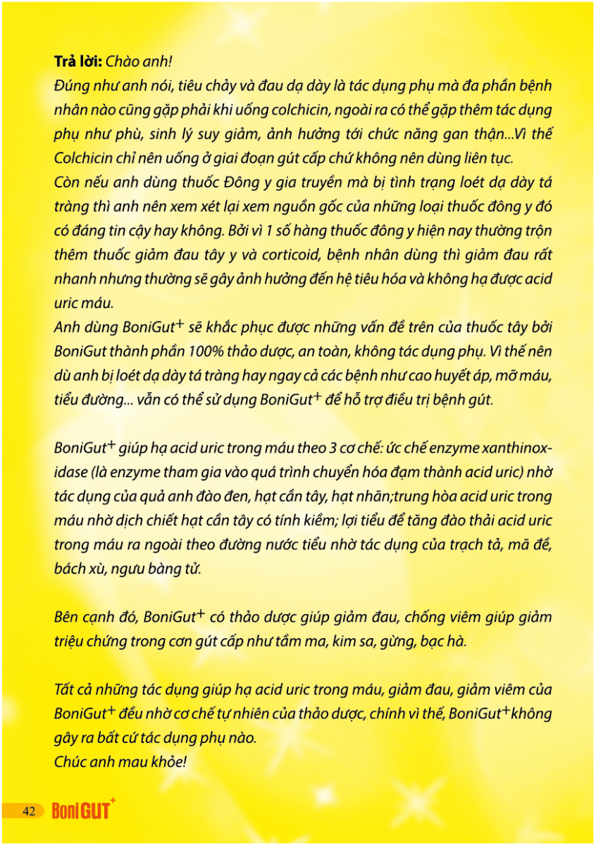 Hỏi: Dùng BoniGut thì a.cid u.ric có hạ không, còn bị đau không?